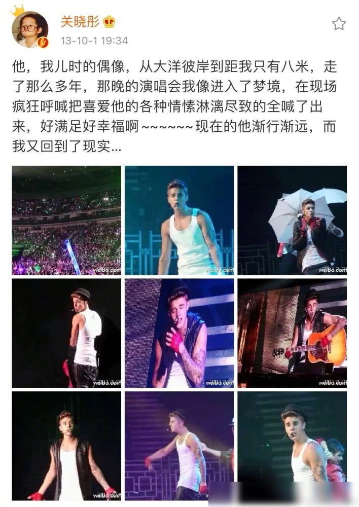 Nếu “soi kỹ” trang cá nhân Weibo của Quan Hiểu Đồng thì bạn có thể biết rằng cô nàng đã thích Justin Bieber được một thời gian rất dài. Vào năm 2013, cô nàng đã đi xem concert của thần tượng khi chỉ mới là học sinh phổ thông. Thời điểm đó, nữ diễn viên còn chia sẻ thông tin trên Weibo, nói rằng bản thân như bước vào giấc mơ, mang hết tình cảm yêu thương la hét hết trong buổi concert đó.