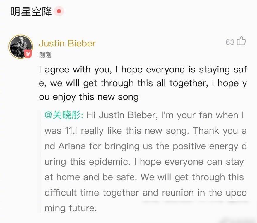 Sau đó cô nàng đã được Justin Bieber phản hồi bài viết: “Anh đồng ý với em, anh hi vọng mọi người đều an toàn. Chúng ta sẽ vượt qua tất cả, hi vọng em thích bài hát mới này“. Sau khi được Justin Bieber để ý và “lật thẻ”, Quan Hiểu Đồng vui mừng đến nhanh chóng trả lời lại: “Em rất vui mừng, em hi vọng anh sẽ vui vẻ mỗi một ngày“.