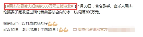 Hai vợ chồng Châu Kiệt Luân và Côn Lăng tuy dẫn hai người con cùng đi nghỉ mát nhưng vẫn quan tâm đến chuyện xảy ra ở Vũ Hán. Sau khi quyên tặng 3 triệu NDT, Châu Kiệt Luân và Côn Lăng còn đăng tải video với nội dung tích cực, cổ vũ cho Vũ Hán, Hồ Bắc cũng như Trung Quốc.