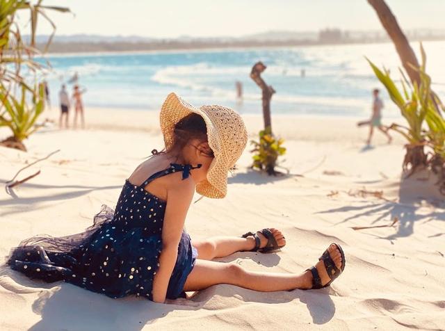 Trong ảnh, Hathaway mặc váy màu xanh và đội nón ngồi ở bãi cát vàng bên bờ biển tràn đầy nắng. Cô bé còn cố ý kéo thấp nón xuống để che nắng, bộ dáng này nhìn vào cực dễ thương.