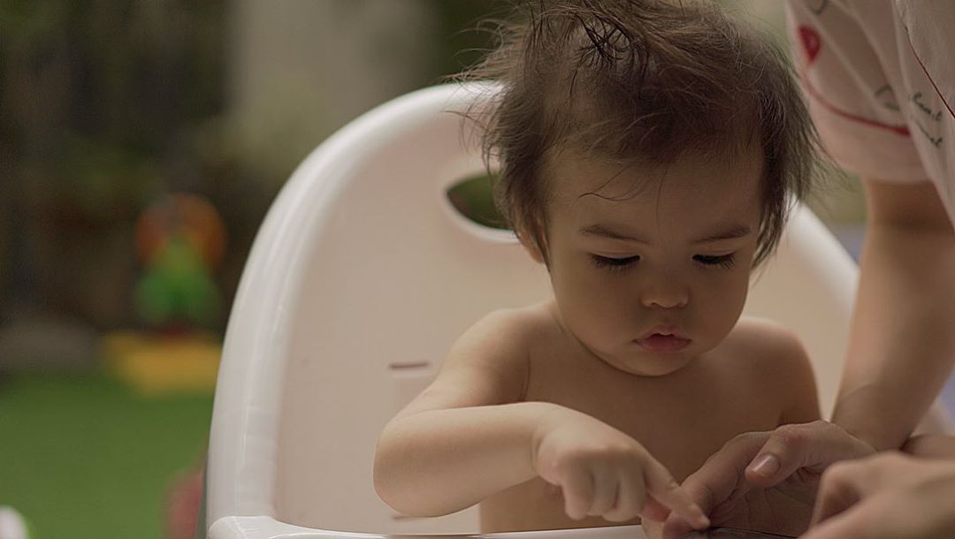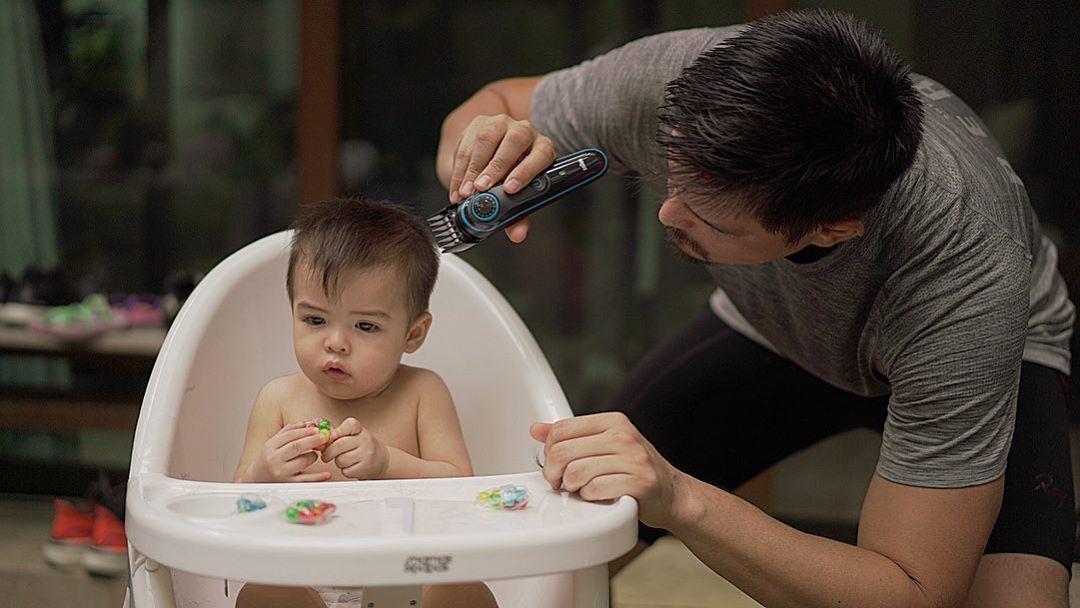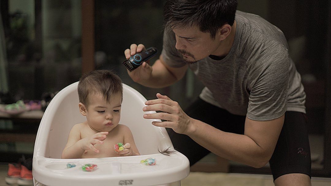 Nam tài tử Dingdong Dantes cũng đã thu hút sự chú ý không kém khi cũng chia sẻ loạt khoảnh khắc cậu bé Ziggy ngồi ngay ngắn trên ghế để bố cắt tóc cho.