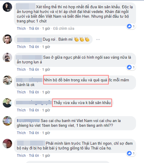 Cụ thể, bạn Nguyễn Thị Tuyết lên bày tỏ quan điểm: “Trời ơi, mình thật sự hụt hững khi xem thiết kế bánh mỳ lộ diện, nó quá so với những gì mình đã ủng hộ ban đầu“. Cùng quan điểm đó, bạn có nickname Nhóc Sule chia sẻ: “Mình biết là việc một NTK trẻ còn quá non kinh nghiệm xử lý chất liệu nên việc hoàn thiện một tác phẩm như thế này là rất khó, nhưng phom dáng, đường thuê may đều bị fail”.