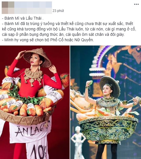 “Nhìn qua là biết đụng hàng với món Lẩu Thái của Thái, mà năm nay Miss Universe 2018 tổ chức bên Thái, không biết số phận sẽ như thế nào nếu Bánh Mì được chọn” - đó là chia sẻ của bạn có tên Oly Thaokoi. Khán giả còn cho rằng, Bánh mì là phiên bản chưa hoàn thiện và đụng ý tưởng với Lẩu Thái của Thái Lan. Cũng ngay sau khi công bố 6 thiết kế, thì Bánh mỳ có vẻ không giữ được thế thượng phong khi mọi sự tập trung đổ dồn về thiết kế Phố cổ và Nữ Quyền.