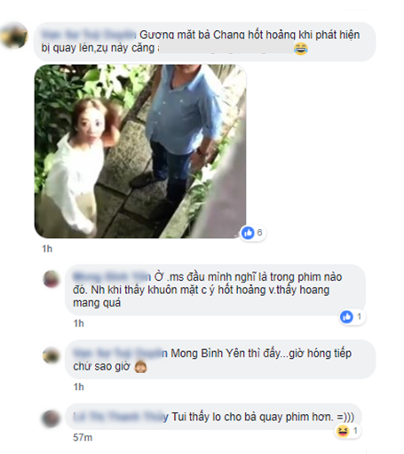 Khá bất ngờ là Thu Trang không phản kháng, thậm chí nữ diễn viên có phản ứng như ăn vụng bị bắt quả tang, tỏ vẻ không muốn trả lời, sợ người khác nghe thấy.