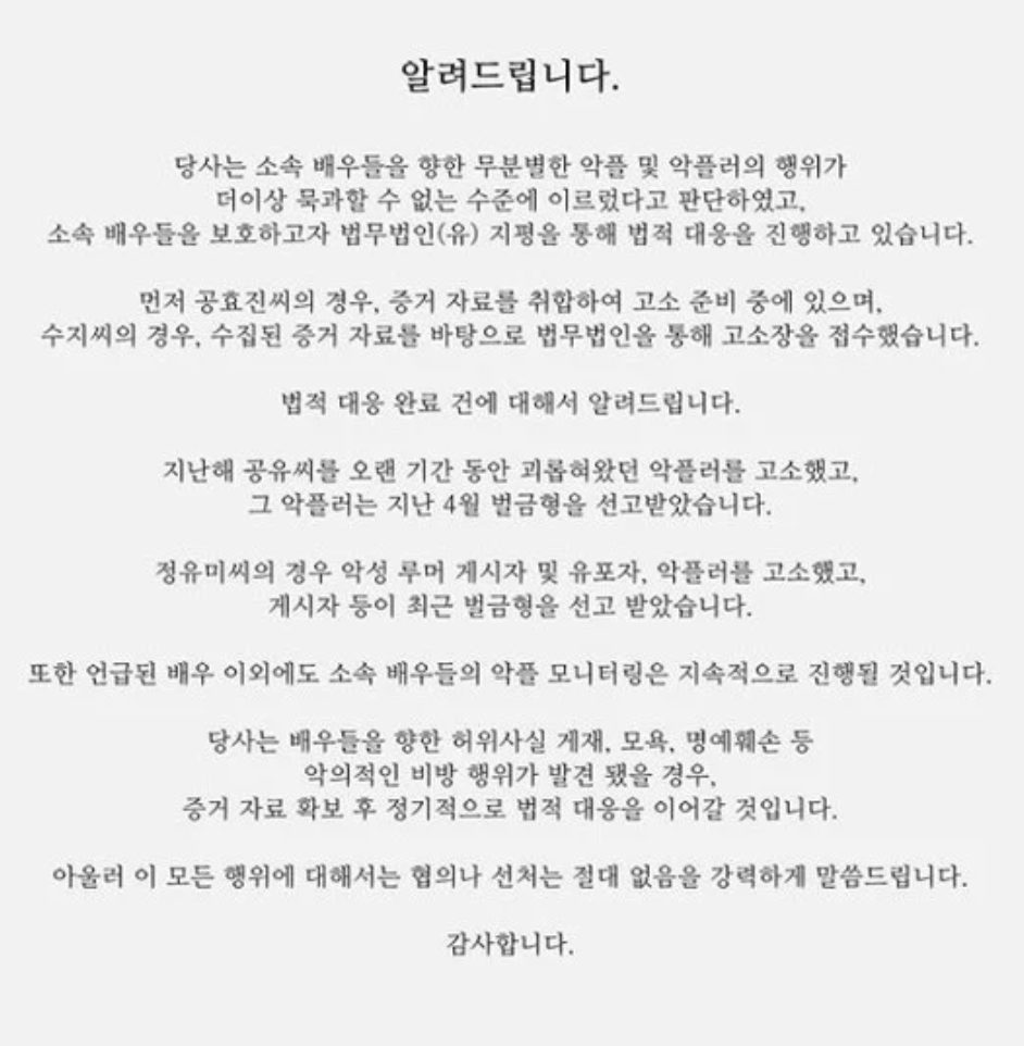Ngoài các diễn viên được đề cập ở trên, SOOP cho biết sẽ tiếp tục theo dõi các bình luận ác ý về những nghệ sĩ khác trong công ty của họ: “Chúng tôi sẽ tiếp tục thực hiện hành động pháp lý sau khi đảm bảo bằng chứng nếu có bất kỳ bình luận độc hại, vu khống, phỉ báng hoặc thông tin sai lệch được đăng tải. Ngoài ra, chúng tôi chắc chắn sẽ không có sự khoan hồng hay dàn xếp cho tất cả những ai thực hiện hành vi này. Cảm ơn các bạn rất nhiều“.