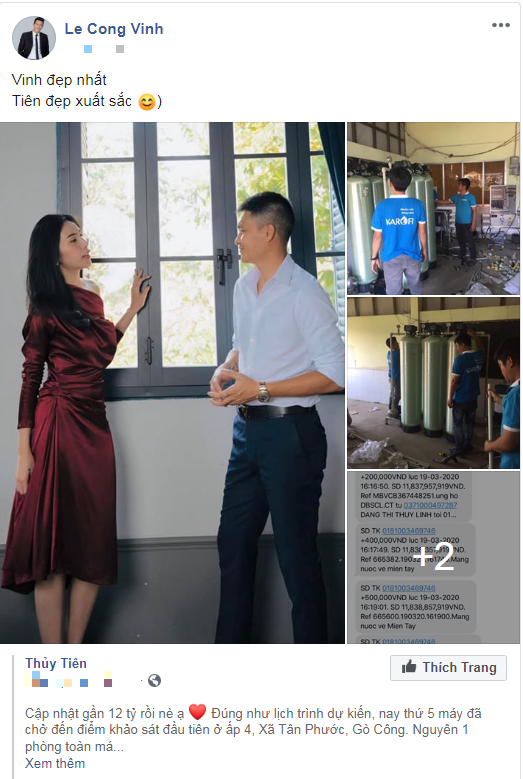 Được biết sau khi nhận được số tiền quyên góp lớn từ mọi người, vợ chồng Công Vinh - Thuỷ Tiên đã cùng nhau đi khảo sát tại các địa điểm để lắp máy lọc nước biển thành nước ngọt, hỗ trợ người dân miền Tây.
