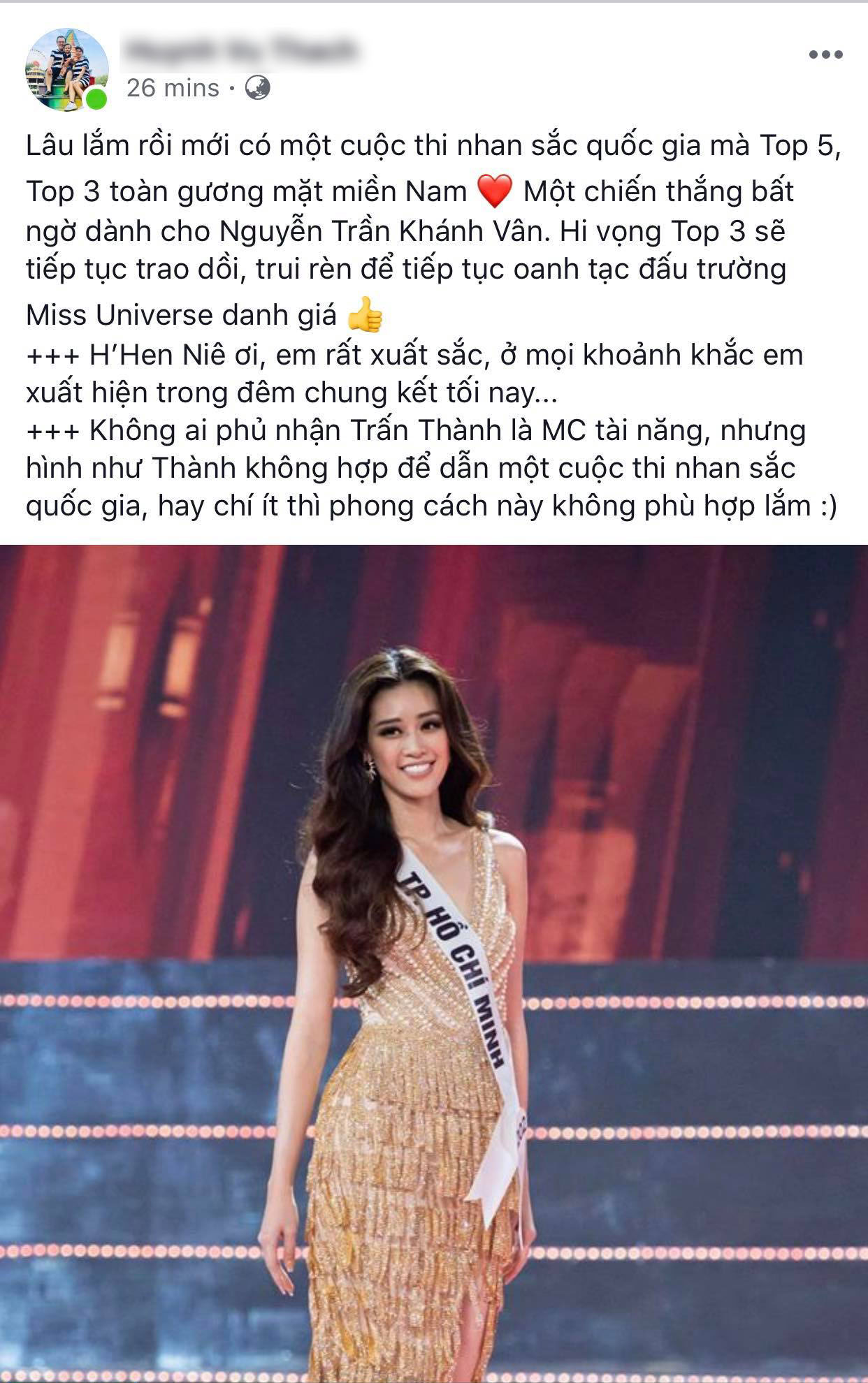 Bất kỳ cuộc thi nào cũng có kẻ thắng, người thua. Và hầu như cuộc thi hoa hậu nào cũng gây tranh cãi về kết quả cuối cùng, ngay cả H'Hen Niê năm 2018 cũng vậy. Tuy nhiên, hãy cứ tin tưởng vào Khánh Vân với cương vị Tân Hoa hậu hoàn vũ Việt Nam 2019. Rồi thời gian tương lai sẽ nói lên tất cả!