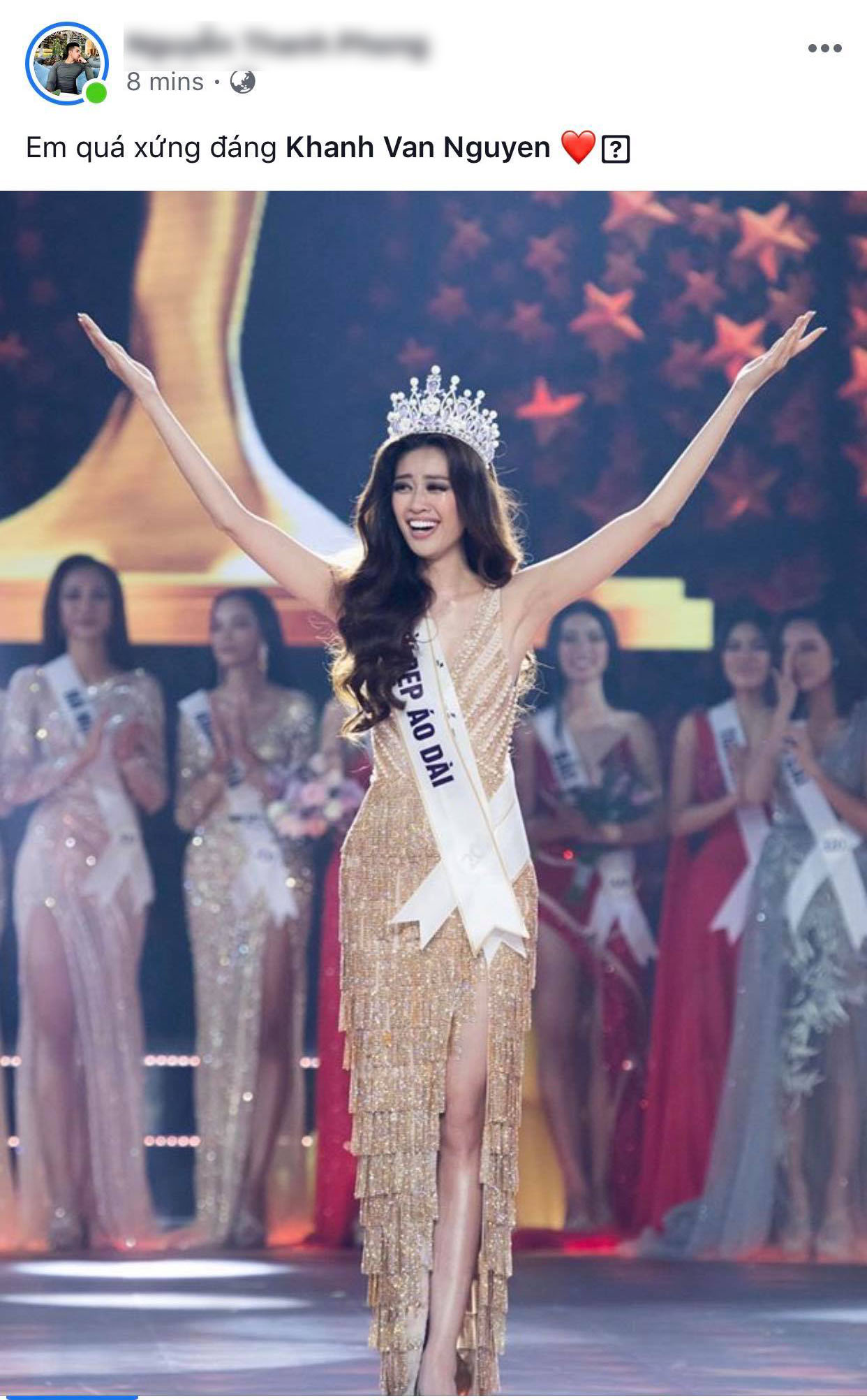 Giây phút đăng quang, Khánh Vân bước trên sân khấu nhận vương miện trong tiếng vỗ tay reo hò nồng nhiệt từ phía người hâm mộ. Ngay lập tức, trên mạng xã hội, cộng đồng mạng cũng thi nhau bàn tán sôi nổi về Tân Hoa hậu mới đăng quang.