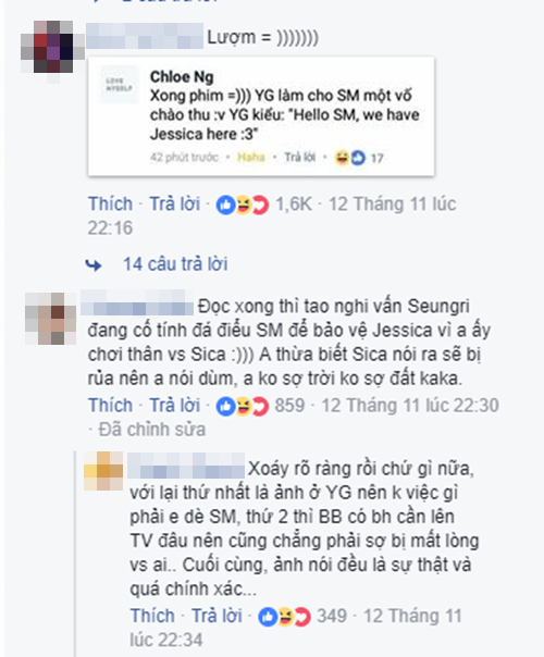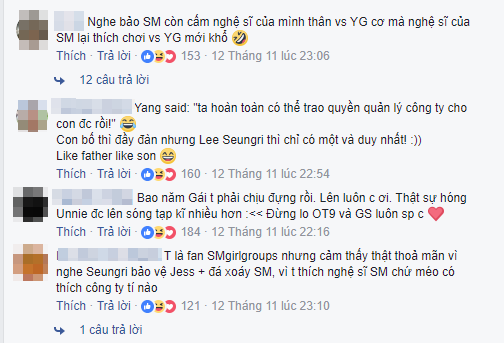 Điều này khiến nhiều fan của Jessica khá thích thú khi Seungri đã ngầm lên tiếng việc cô nàng không thể lên sóng các đài truyền hình lớn sau khi rời khỏi SM. Và nhiều fan cho rằng đây là sự lém lỉnh muốn đá xéo SM về sự độc tài và chèn ép các idol sau khi rời khỏi công ty của cậu út BigBang.