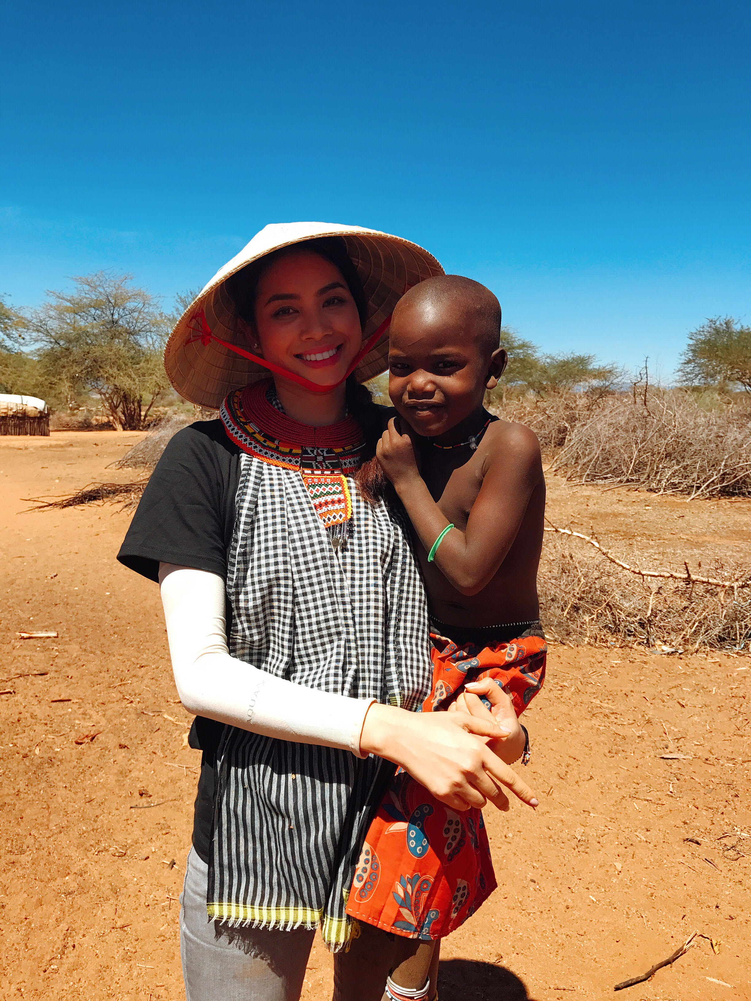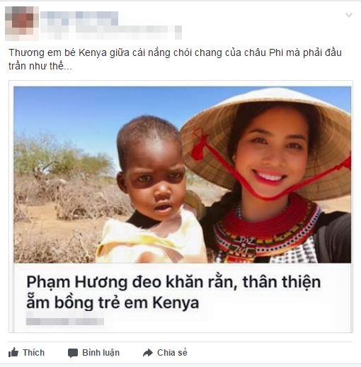 Mới đây, hình ảnh Hoa hậu hoàn vũ Việt Nam Phạm Hương tươi cười bên một em bé Kenya giữa trời nắng, trong khi đó người đẹp lại đội nón được cộng đồng mạng chia sẻ với nhiều bình luận trái chiều.