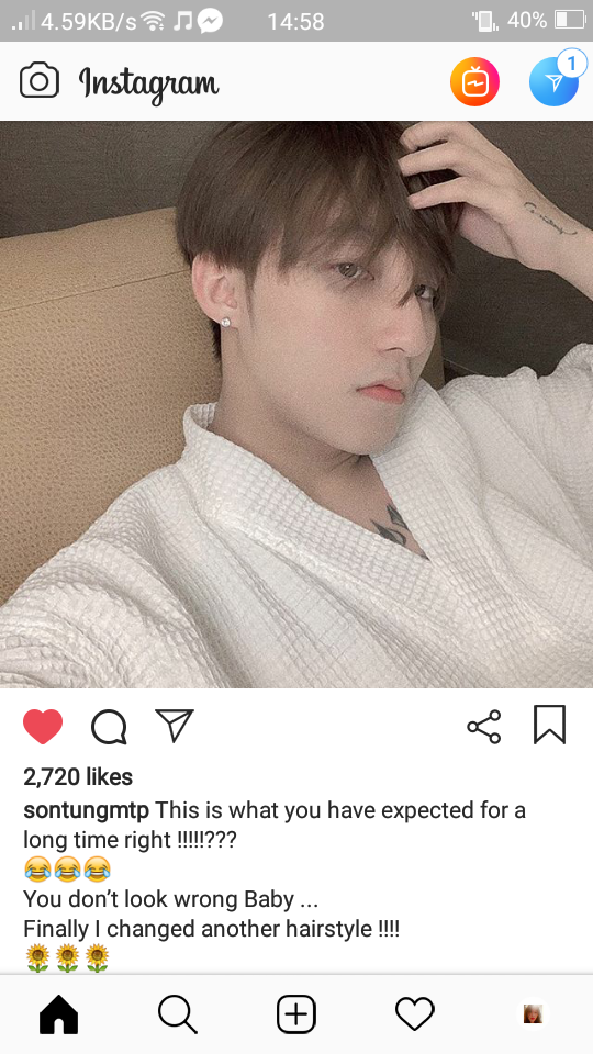 Sau mấy ngày, Sơn Tùng M-TP đã tự đăng hình lên Instagram cá nhân để khoe với Sky về kiểu tóc mới. Điều đáng nói là Sơn Tùng nghĩ người hâm mộ mình đang mong đợi được nhìn thấy bộ tóc mới này từ rất lâu rồi nên nam ca sĩ rất hứng thú. Cụ thể anh đã để lại caption: “Đây là điều mà các bạn mong đợi từ rất lâu rồi phải không? Cuối cùng mình cũng đã thay đổi kiểu tóc khác rồi nè!!!!!”