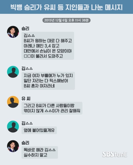 Seungri: “Kim à, làm như lời cô B nói đi, đặt một chỗ ở khu vực chính 3, 4 ở Arena. Có một khách hàng từ Đài Loan đến. Gọi số này để nhờ giúp đi nhé”. Kim: “Em gọi gái kiểu gì đây ạ? Khách là người Trung ạ? Ôi trời ơi. Dù sao thì em cũng vừa sắp chỗ xong rồi nhé anh. Em đoán chỉ có B là phụ nữ thôi”. Ông Yu: “Kim à, đảm bảo rằng cô B không bị bắt gặp với những người khác nhé”. Kim: “Em sẽ luôn ở bên cô ấy ạ”. Seungri: “Làm việc chỉn chu vào và đừng làm hỏng chuyện đấy”.