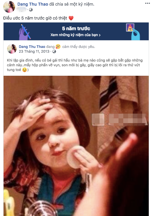 Mới đây, Hoa hậu Đặng Thu Thảo lại gây chú ý khi chia sẻ lại một kỷ niệm cũ trên Facebook từ 5 năm về trước đi kèm với dòng trạng thái vô cùng ý nghĩa: “Điều ước 5 năm trước giờ có thiệt”. Cụ thể, người đẹp đã chia sẻ bức hình bé gái nghịch tung hộp phấn son với caption: “Khi lập gia đình, nếu có bé gái thì hầu như bà mẹ nào cũng sẽ bắt gặp những cảnh này… Mấy hộp phấn vỡ vụn, son môi bị gãy, giày cao gót thì bị lôi ra thử vứt tung tóe”.