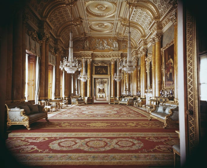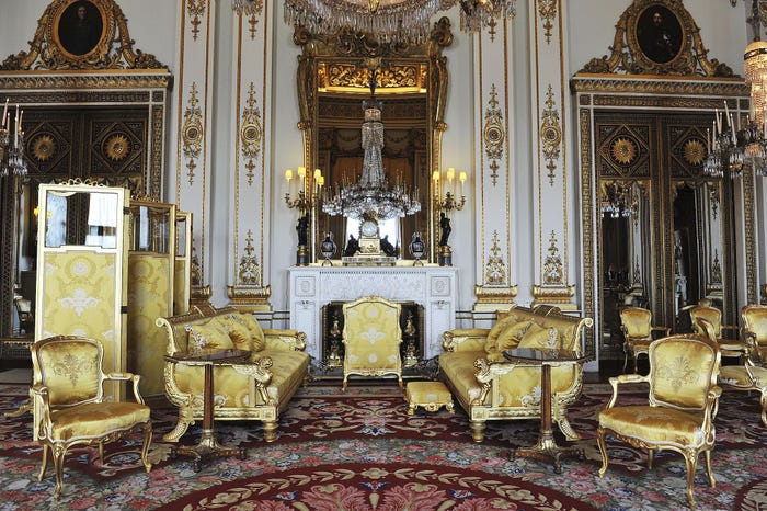 Phòng Throne của cung điện được sử dụng cho các bữa tiệc cấp nhà nước, nơi Nữ hoàng gặp mặt các nhà lãnh đạo thế giới và nguyên thủ quốc gia.