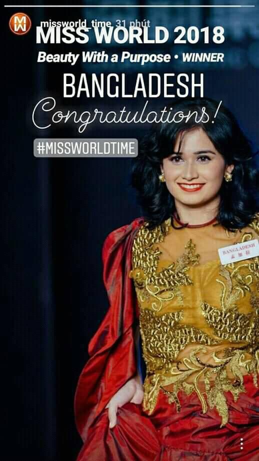 Tổ chức Hoa hậu Thế giới vừa công bố kết quả phần thi phụ Head 2 Head Challenges, trong đó cô gái 18 tuổi đến từ Bangladesh đã tạo được ấn tượng mạnh trong phần thi Beauty With A Purpose (Hoa hậu Nhân Ái) . Đây là lần thứ hai, Bangladesh có mặt tại đấu trường nhan sắc lớn nhất hành tinh và với thành tích đầu tiên này, Hoa hậu Bangladesh 2018 đã tạo nên lịch sử cho đất nước của mình.