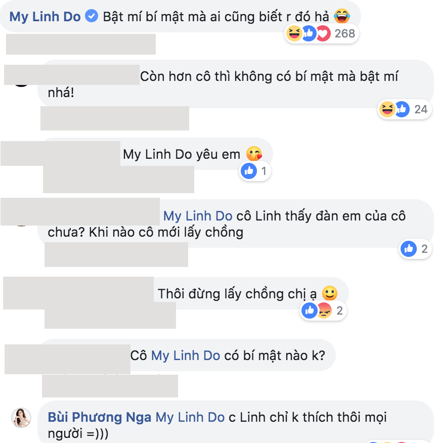 Hoa hậu Việt Nam - Đỗ Mỹ Linh bị bạn bè “chọc ghẹo” khi thả bình luận về chuyện công khai của Á hậu Phương Nga với diễn viên Bình An. Trong status xác nhận “hẹn hò” của đàn em, Hoa hậu Đỗ Mỹ Linh viết: “Bật mí bí mật mà ai cũng biết rồi đó hả”. Sau lời nói “trêu đùa” của Hoa hậu Nhân Ái Thế giới, rất nhiều bạn bè của Đỗ Mỹ Linh quay vào hỏi ngược lại: “Còn hơn cô thì không có bí mật mà bật mí nhá”.