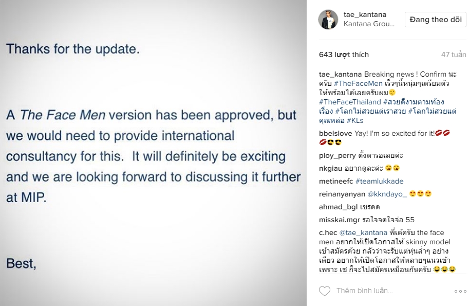 Nhà sản xuất của The Face Thailand cũng từng lên tiếng xác nhận sẽ có một phiên bản dành cho nam trong tương lai gần.