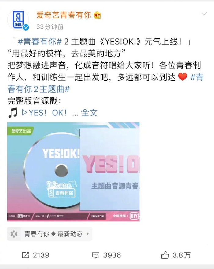 Có lẽ “tình yêu” của iQiYi và Tencent giành cho nhau là “bất diệt” vì hai nhà cứ liên tiếp “đá đểu” nhau từ những vụ việc nhỏ nhặt nhất. Trước đó, khi iQiYi đăng tải bài hát chủ đề Yes! Ok! với điểm nhấn: “Dùng hình thức tốt nhất, đi đến những nơi đẹp nhất“ thì phía Tencent nhanh chóng đáp trả: “No, thanks” kèm theo một đoạn video các thực tập sinh bên họ thực hiện vũ đạo và cùng hát ca khúc chủ đề trong Sáng tạo doanh 101.