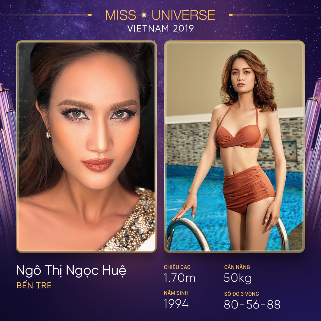 Ngô Thị Ngọc Huệ là một trong những thí sinh sở hữu nét đẹp hiện đại rõ rệt, cô từng là người mẫu xuất hiện trong nhiều chương trình và show diễn thời trang trong nước. Là cô gái ở một tỉnh miền Tây sông nước mang trong mình quan điểm sống hết mình và không ngừng nỗ lực theo đuổi ước mơ, Ngọc Huệ hy vọng Hoa hậu Hoàn vũ Việt Nam 2019 sẽ là bước đệm để cô có cơ hội được nói lên tiếng nói của mình ở đấu trường nhan sắc quốc tế.