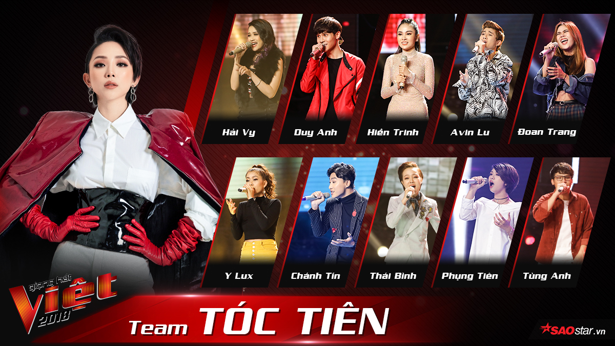 Là HLV về đích nhanh nhất, Tóc Tiên hoàn chỉnh đội hình 10 thí sinh gồm: Hải Vy, Duy Anh, Hiền Trinh, Avin Lu, Đoan Trang, Y Lux, Chánh Tín, Thái Bình, Phụng Tiên và Tùng Anh.