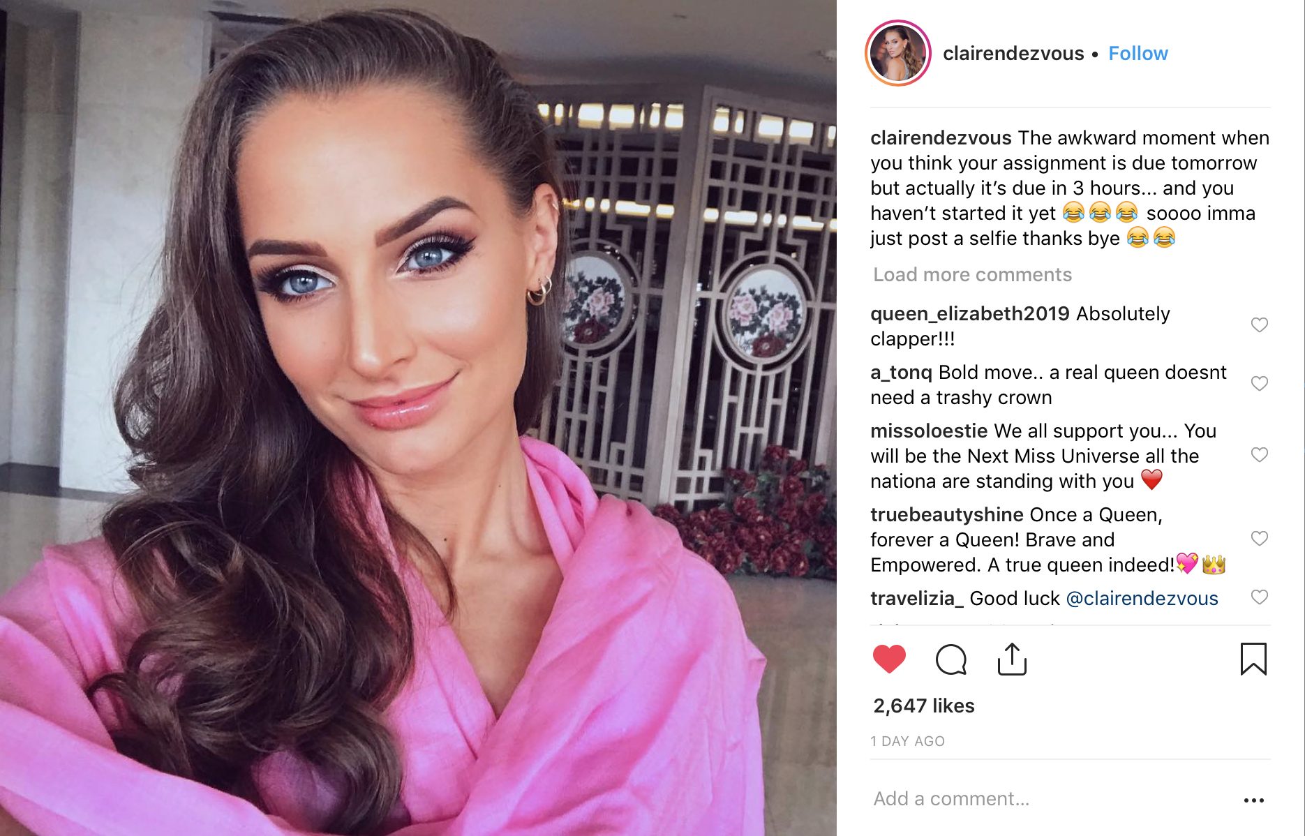 Chia sẻ đầy ẩn ý trên tài khoản instagram kèm bức hình gợi cảm, người đẹp thông minh khi đề cập đến việc “tước danh hiệu”: “Khoảnh khắc khó xử nhất là khi bạn nghĩ rằng hạn nộp bài tập của mình sẽ đến vào ngày mai nhưng thực tế là chỉ còn 3 giờ nữa …và bạn vẫn chưa bắt đầu nó” (tạm dịch).