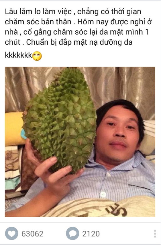 Sầu riêng là một loại trái cây thơm ngon, bổ dưỡng, nhưng có ai ngờ rằng khi qua tay Hoài Linh thì nó đã trở thành một sản phẩm “skincare” hết sức lạ lùng. Nam danh hài khiến cư dân mạng một phen cười ôm bụng khi đăng trên trang cá nhân của mình dòng chia sẻ hết sức hài hước. Anh viết: “Lâu lắm lo làm việc, chẳng có thời gian chăm sóc cho bản thân. Hôm nay được nghỉ ở nhà, cố gắng chăm sóc lại da mặt mình một chút. Chuẩn bị đắp mặt nạ dưỡng da”, kèm theo đó là trái sầu riêng đầy gai góc.