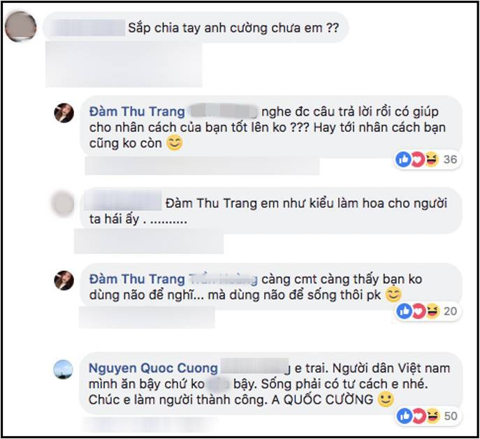 Cụ thể, mới đây, sau khi Đàm Thu Trang chia sẻ bức ảnh hình ảnh selfie đơn lẻ lên trang cá nhân, một khán giả đã phản ứng một cách dữ dội về chuyện tình cảm của cô và chồng cũ Hà Hồ: “Sắp chia tay Cường chưa em?”. Để đáp trả lại antifan, Đàm Thu Trang cũng đã gay gắt phản ứng. Nhập cuộc chiến “đối đầu” với anti không chỉ Đàm Thu Trang mà cả Cường Đô La cũng lên tiếng để bảo vệ người đẹp gốc Lạng Sơn này. Cường Đô La khuyên khán giả này nên “sống phải có tư cách”, nam doanh nhân phố núi còn để lại lời nhắn “Chúc em làm người thành công. Anh Quốc Cường” khiến dân mạng cảm thấy anh cũng “xéo xắt” không kém.