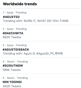 Theo báo cáo, D-2 có tổng cộng 10 bài hát thuộc nhiều thể loại khác nhau và đã được Big Hit Entertainment chia sẻ trong các liên kết trên tài khoản Twitter. Bên cạnh đó, sự trở lại của nam ngôi sao đã nhanh chóng chiếm được các vị trí hàng đầu về xu hướng trên toàn thế giới trên Twitter.