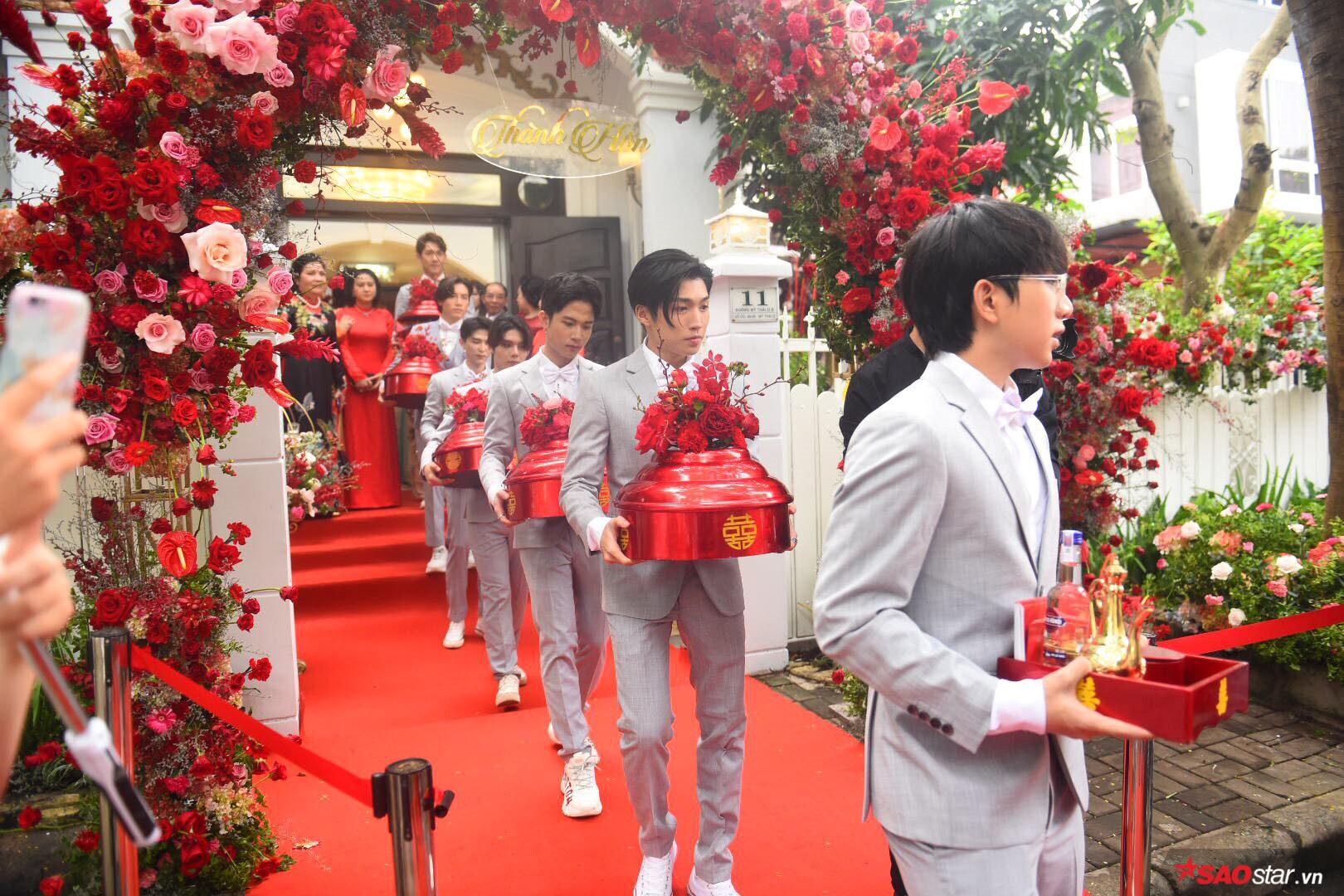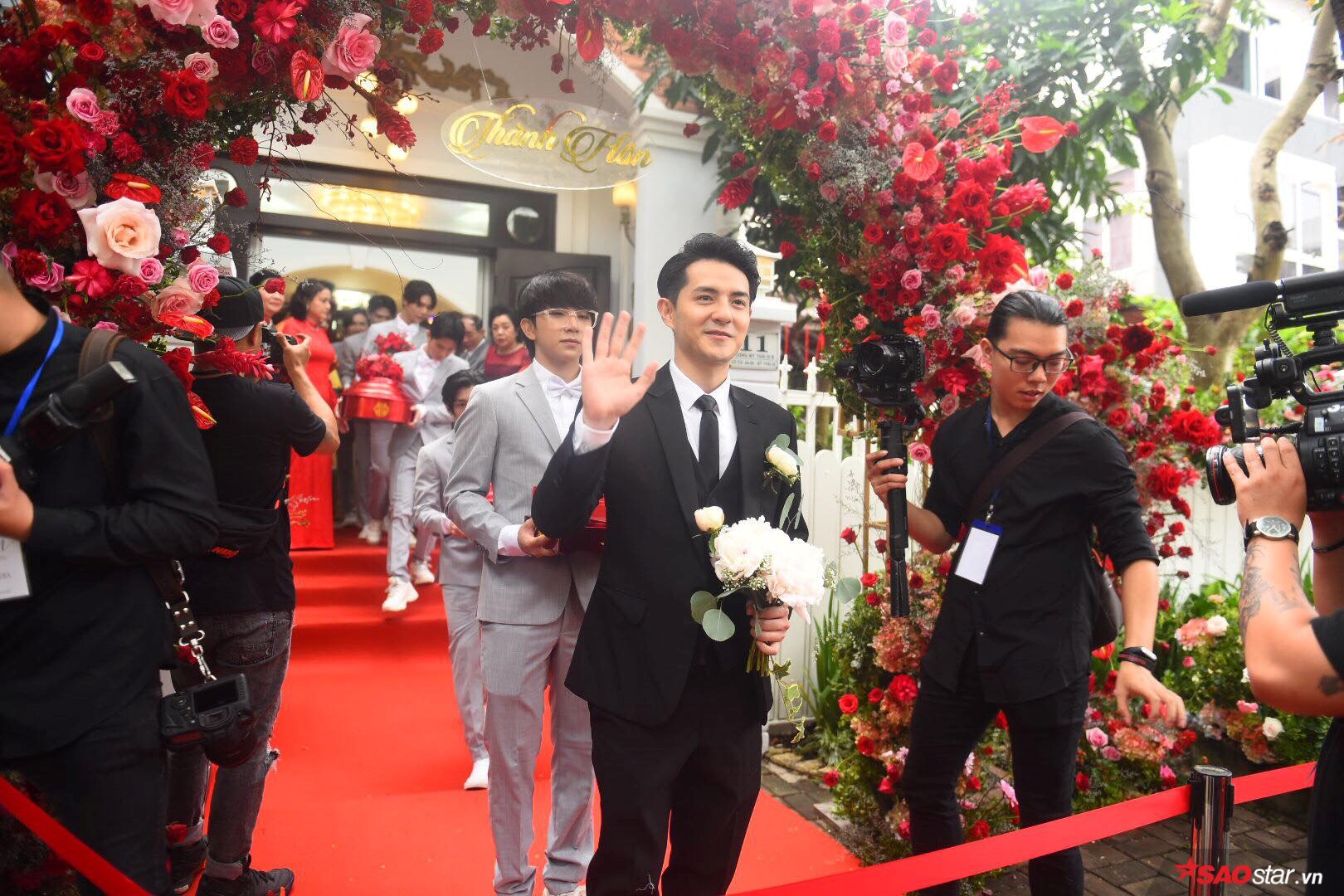 Sau khi hoàn tất khâu chuẩn bị cho phía nhà mình, nam ca sĩ Ông Cao Thắng - chú rể hạnh phúc nhất hôm nay - đã dẫn đầu đoàn nhà trai sang rước dâu.