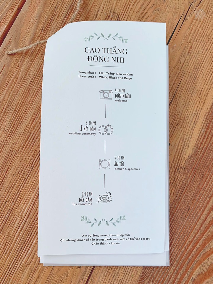 Phía bên trong thiệp cưới, có để lịch trình cũng như thời gian tổ chức lễ cưới. Ngày 9/11, khách mời sẽ di chuyển từ TP.HCM và Phú Quốc. Và ngày 10/11 sẽ di chuyển từ Phú Quốc về Sài Gòn. Các khách mời đều đã được đặt vé máy bay và chỗ ở.