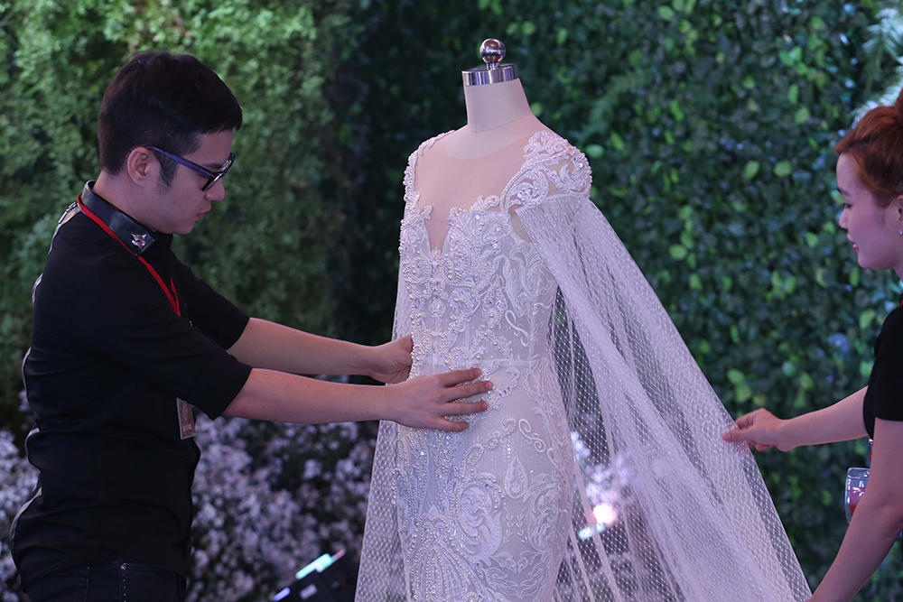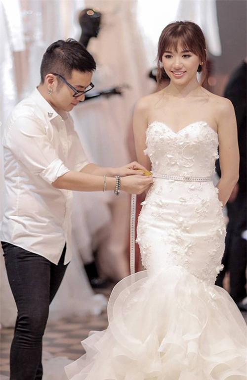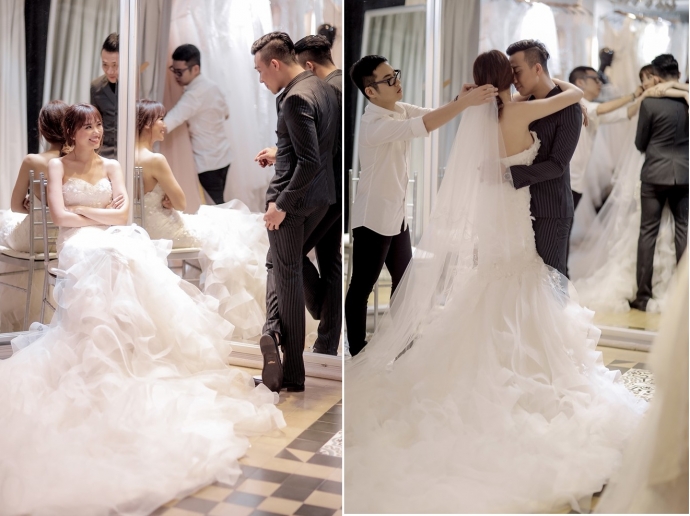 Trước giờ cưới, Chung Thanh Phong tỉ mỉ xem xét lại chiếc váy cưới được đặt riêng cho Hari Won.