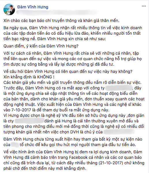 Mr.Đàm cho biết bản thân không liên quan đến công ty này và cũng chưa từng xuất hiện hay tham gia bất kỳ sự kiện nào để kêu gọi, thu hút mọi người đầu tư tiền ảo. Việc hình ảnh của “ông hoàng nhạc Việt” bị đem ra lợi dụng kinh doanh, anh đã cảnh báo trên Facebook cá nhân và báo chí từ trước chứ không phải đến thời điểm này mới khẳng định.