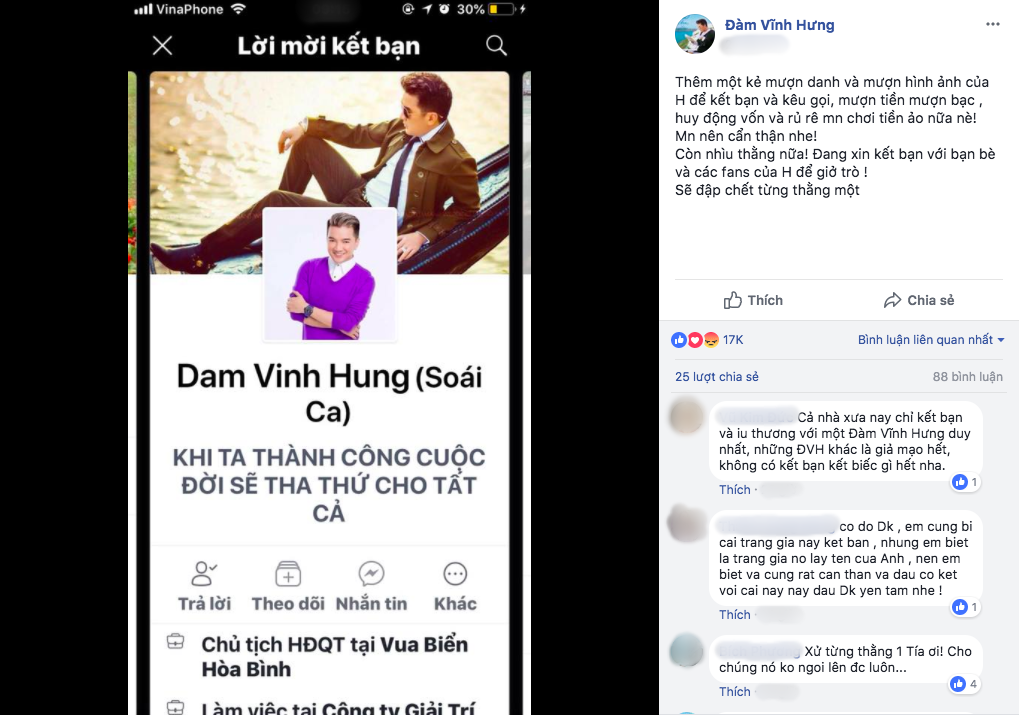Mới đây, thông qua trang Facebook cá nhân, Đàm Vĩnh Hưng vô cùng bức xúc khi có kẻ mượn danh và hình ảnh của anh để kết bạn, mượn tiền và rủ rê mọi người chơi tiền ảo.