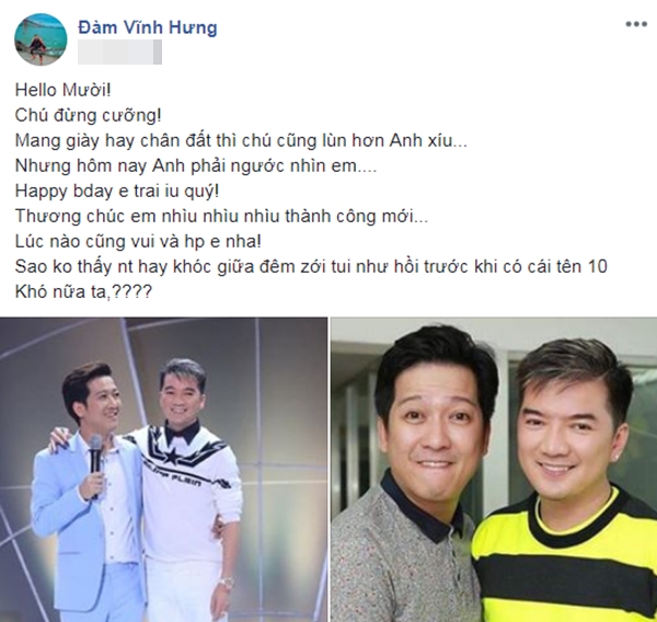 Mr. Đàm hóm hỉnh chúc mừng sinh nhật “Mười Khó”: “Hello Mười. Chú đừng cưỡng. Mang giày hay chân đất thì chú cũng lùn hơn anh xíu nhưng hôm nay Anh phải ngước nhìn em. Happy birthday em trai yêu quý. Thương chúc em nhiều thành công mới”.