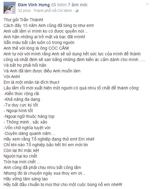 Mới đây, nam ca sĩ Đàm Vĩnh Hưng đã có những chia sẻ trên trang cá nhân để động viên Trấn Thành. “Ông hoàng nhạc Việt” nhắc lại sự việc cách đây 15 năm, anh cũng rơi vào trường hợp tương tự ông xã Hari Won. Sau tất cả, Mr. Đàm đã tự nhủ với lòng phải cố gắng thành công, san bằng những định kiến ác cảm về mình và bắt mọi người phải hối hận với những điều đã làm.