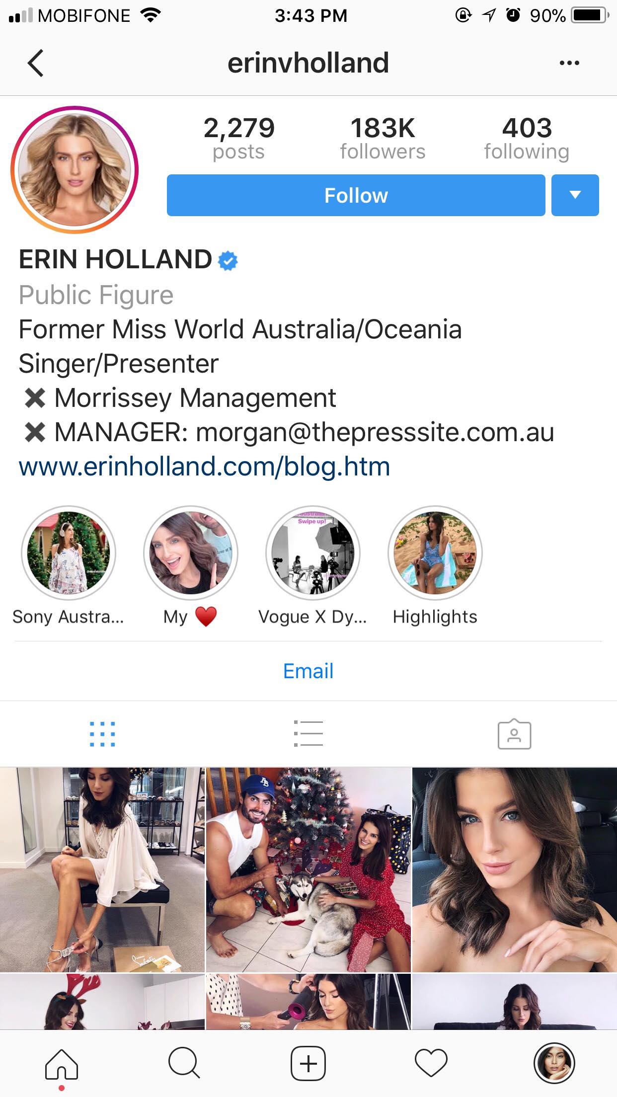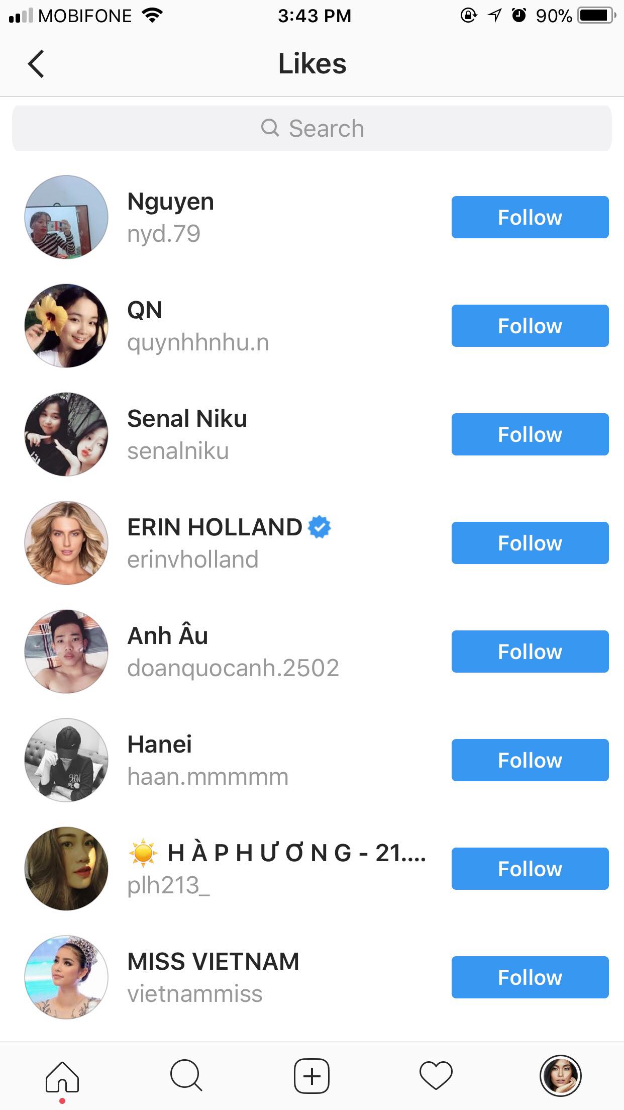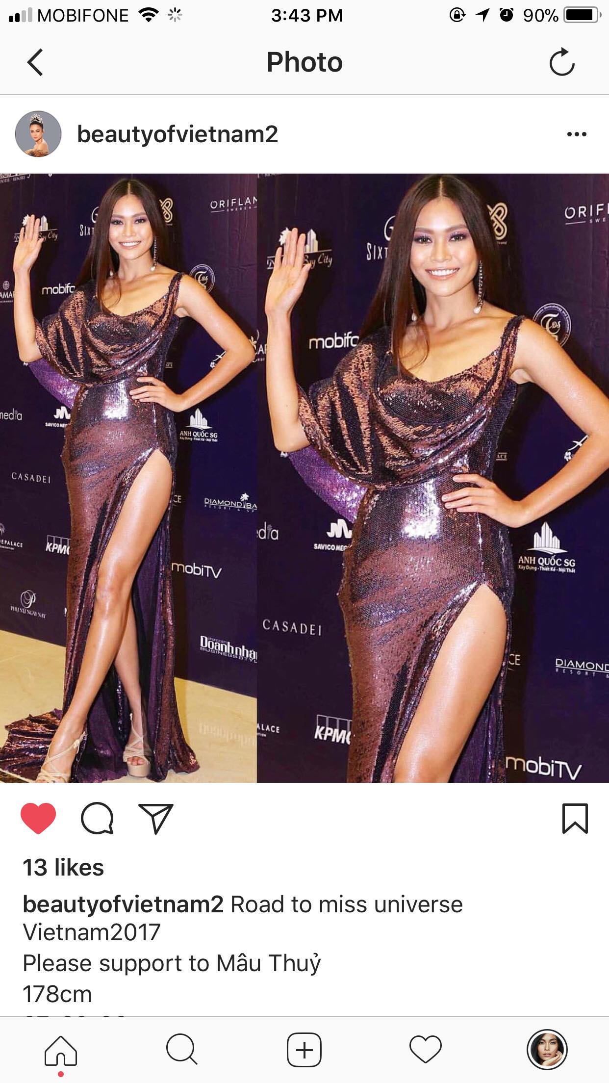 Bên canh đó, cư dân mạng cũng bất ngờ khi phát hiện Hoa hậu Thế giới Australia 2013 Erin Holland bấm thích bức hình của Mâu Thuỷ trên trang Instagram của Beautiofvietnam2 - chuyên trang đăng ảnh của các thí sinh Miss Universe Vietnam 2017.