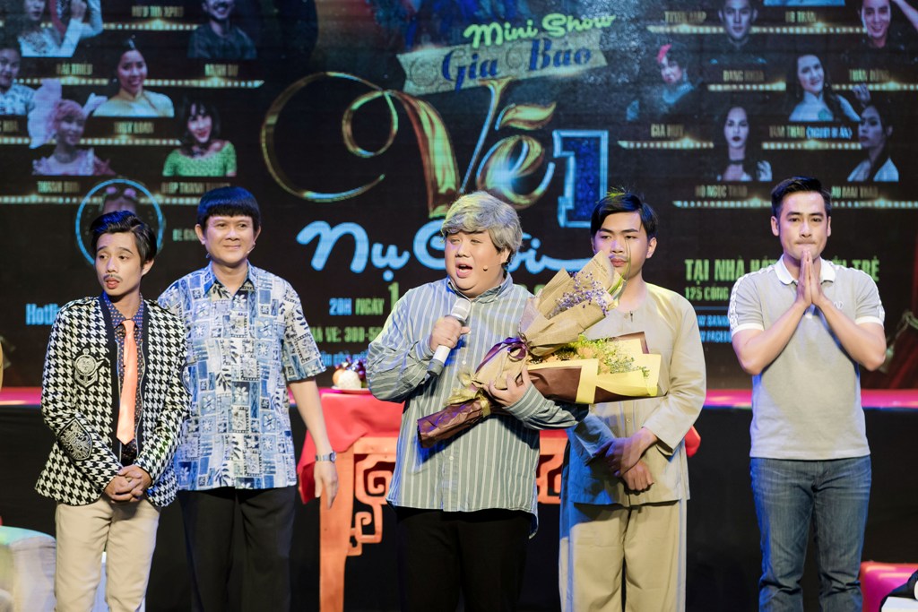 Qua đó, Gia Bảo cũng chia sẻ về lý do tại sao hay giả gái trong suốt nhiều năm làm nghề: “Bảo có 16 năm làm nghề nhưng hết 8 năm đầu là đóng vai quần chúng, vai phụ không hà. Rồi khi có vai diễn đầu tiên lại là vai giả gái. Sau đó, Bảo còn đóng nhiều vai già, xấu đủ mọi cảm xúc. Bảo nghĩ đó là duyên nghề của mình rồi. Khi Bảo đứng trên sân khấu này đây, Bảo muốn gửi lời tri ân đến 2 người thầy đã dạy mình những nét diễn đầu tiên là NSƯT Thành Lộc và NSƯT Hoài Linh”.
