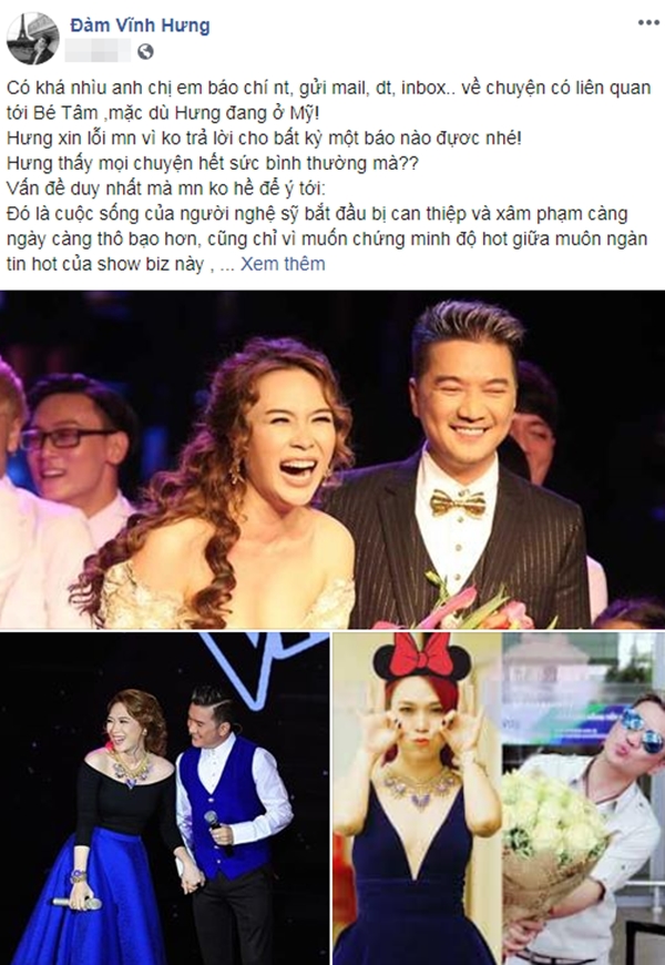 Là một người anh thân thiết và luôn yêu quý Mỹ Tâm trong suốt những năm qua, Đàm Vĩnh Hưng thẳng thắn nhắn nhủ: “Bé ơi! Theo Anh thì em cứ vui đi, làm những gì em thích, làm những gì em thấy đúng (em luôn đúng ….kkk nhớ câu này hông?). Em và Anh hay nhiều đồng nghiệp khác đã KHÔNG SỐNG CHO MÌNH quá lâu rồi Bé ạ! Gửi đến Em những dòng suy nghĩ vội vã trước giờ cất cánh! Dù Mỹ Tâm có chọn ai, yêu ai, lấy ai thì mãi mãi Đàm Vĩnh Hưng cũng chỉ yêu thương một mình em thôi“.
