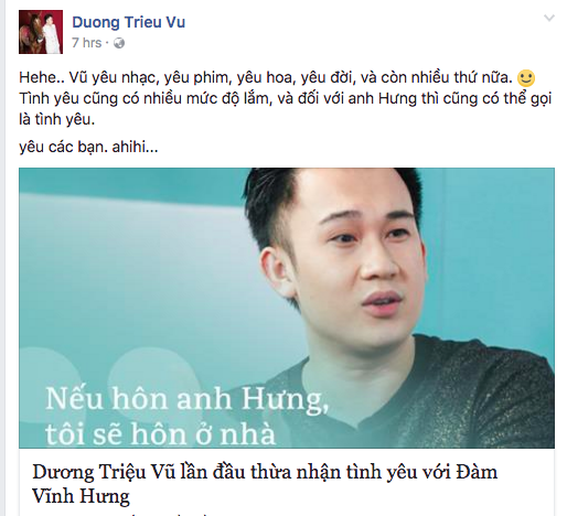 Ngày 9/1, người hâm mộ khá xôn xao biết thông tin Dương Triệu Vũ bất ngờ thừa nhận chuyện tình yêu với Đàm Vĩnh Hưng trong một bài phỏng vấn. Ngay cả trên trang Facebook cá nhân, Dương Triệu Vũ còn vui vẻ viết dòng trạng thái: “Vũ yêu nhạc, yêu phim, yêu hoa, yêu đời, và còn nhiều thứ nữa. Tình yêu cũng có nhiều mức độ lắm, và đối với anh Hưng thì cũng có thể gọi là tình yêu…”.