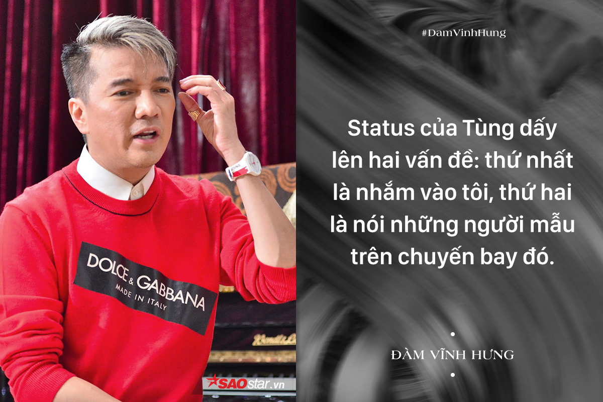 - Việc gì cũng có lý do của nó và xảy ra theo hai chiều nên cần lắng nghe mọi thứ. Tôi suy nghĩ tới lui rất nhiều lần. Nói thẳng ra tôi là người nhạy cảm và nghĩ status của Tùng đó là “một ná bắn hai chim”, vừa chỉ những người mẫu trên máy bay vừa nhắm đến nghệ sĩ. Câu nói ấy là sự thể hiện cái quá khích, thể hiện sự tự do của người nghệ sĩ. Tùng có lý của Tùng, tôi có lý do của tôi.