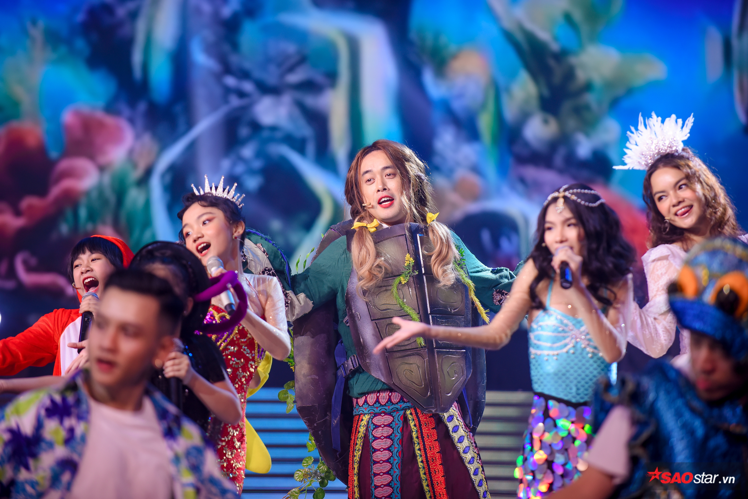 Nếu HLV Phạm Quỳnh Anh hóa thân thành công chúa san hô với vẻ đẹp ngọt ngào, duyên dáng thì HLV Dương Khắc Linh lại khiến Hương Giang - Dương Cầm và Lưu Thiên Hương - Ali Hoàng Dương ngỡ ngàng vì tạo hình chú rùa điệu nghệ đánh má hồng, môi son.