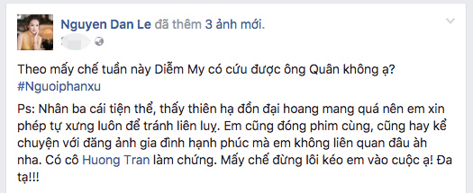 “Nhân ba cái tiện thể, thấy thiên hạ đồn đại hoang mang quá nên em xin phép tự xưng luôn để tránh liên luỵ. Em cũng đóng phim cùng, cũng hay kể chuyện với đăng ảnh gia đình hạnh phúc mà em không liên quan đâu nha. Có cô Hương Trần làm chứng. Mấy chế đừng lôi kéo em vào cuộc ạ! Đa tạ!” - Đan Lê viết.