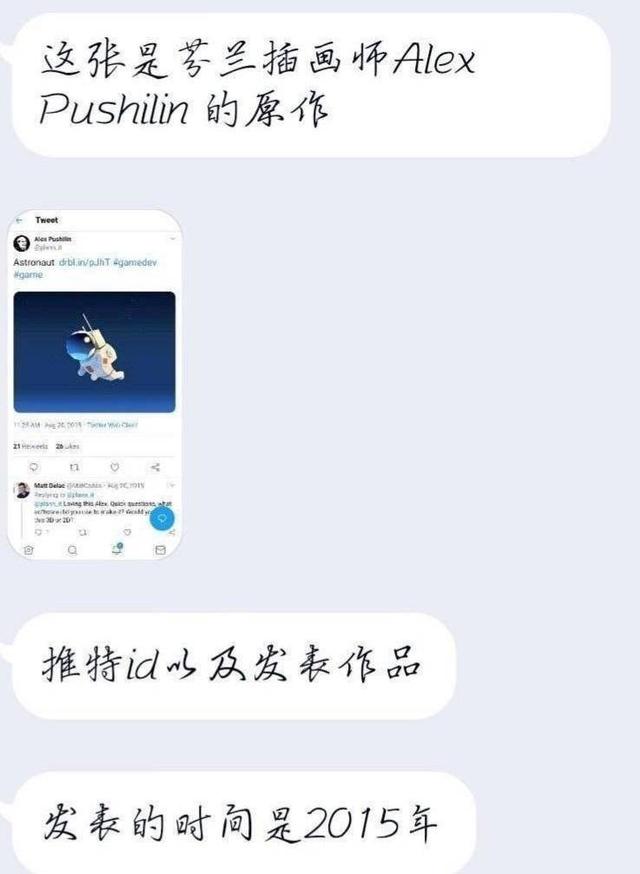 Trước mắt, có người tìm được một vài bức ảnh mà Tiêu Chiến đăng tải lên mạng vài năm trước, đồng thời chỉ ra những điểm tương đồng trong hình ảnh này với tác phẩm của nhà thiết kế đồ họa nổi tiếng người Phần Lan (gần như là một). Thế nhưng, theo miêu tả trong bài viết của Tiêu Chiến, anh lại ám chỉ đây là sản phẩm của mình: “Nhìn ra đây là bức tranh gì không? Chị quản lý hỏi tôi có phải lại ngứa nghề rồi không?”