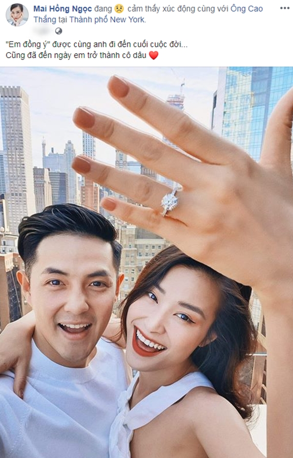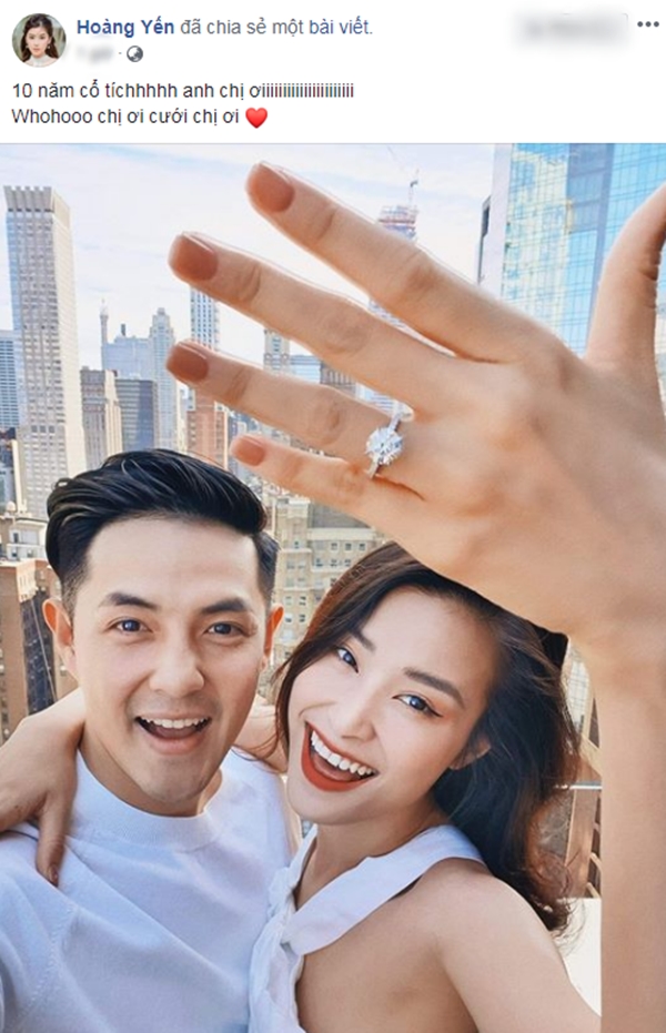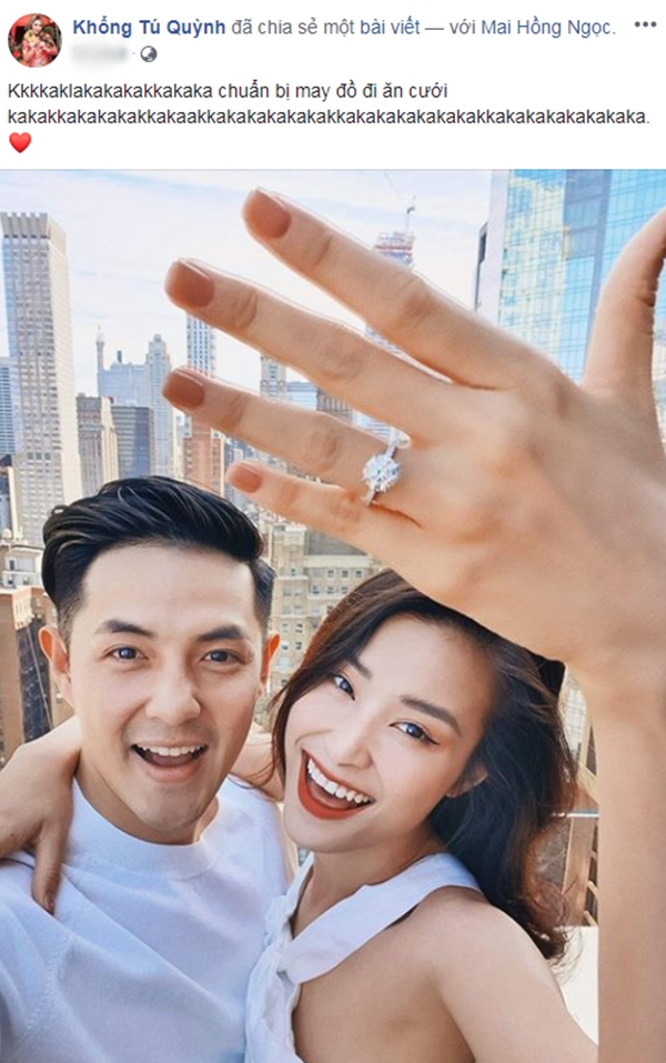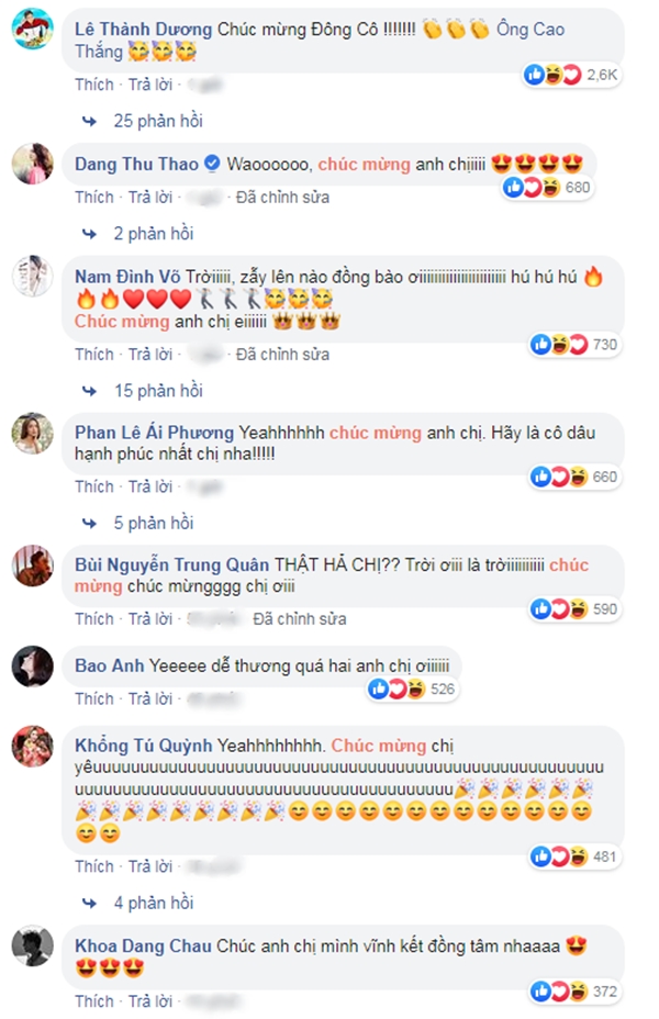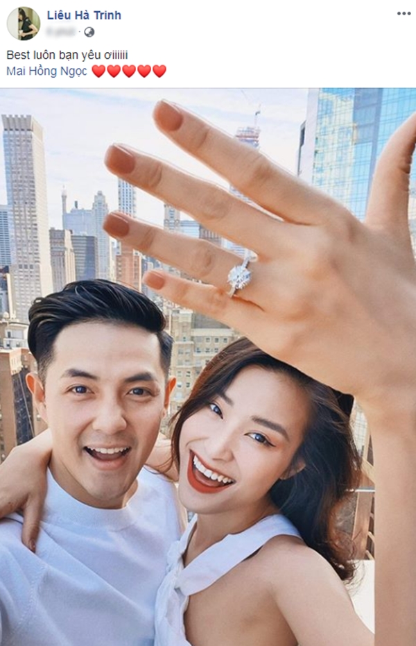 Liêu Hà Trinh gửi lời chúc mừng đến cặp đôi, cách đây không lâu nữ MC xinh đẹp cũng vừa được bạn trai ngọt ngào cầu hôn.