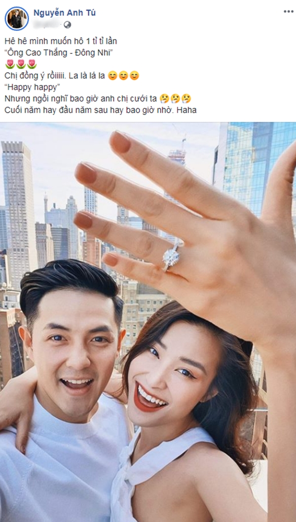 Sáng nay, thông tin Ông Cao Thắng cầu hôn Đông Nhi khiến cho cộng đồng mạng không khỏi xôn xao, ai nấy đều mừng rỡ cho cái kết đẹp của đôi “tiên đồng ngọc nữ”. Thế là sau khoảng thời gian ròng rã đi ăn cưới, cuối cùng cả hai đã chuẩn bị có cho mình một “hôn lễ cổ tích” được cả showbiz Việt mong chờ. Cùng với đông đảo người hâm mộ, các nghệ sĩ cũng không quên dành những lời chúc tốt đẹp cho Đông Nhi - Ông Cao Thắng.