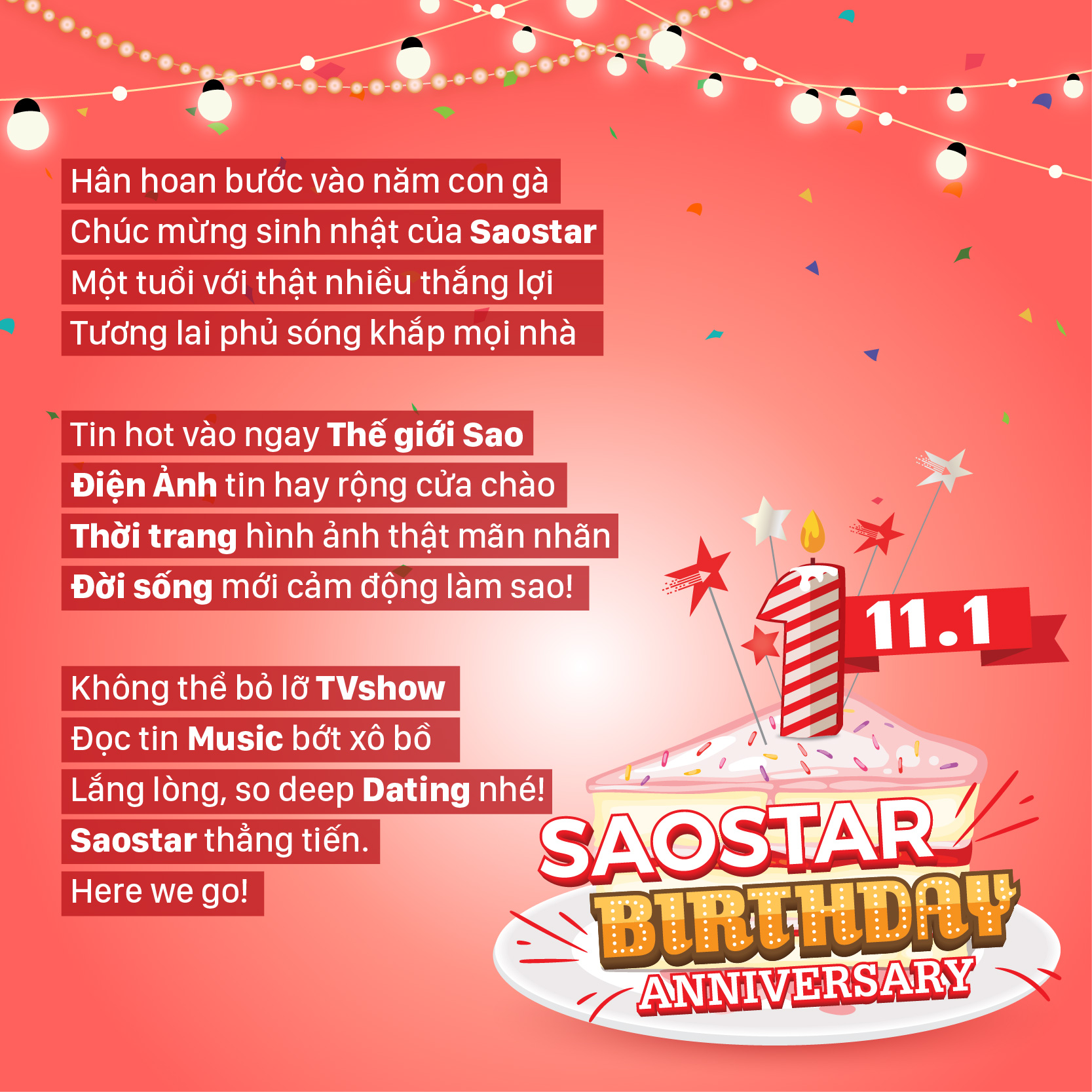 Ngày 11/1/2017, Saostar hân hoan mừng sinh nhật tròn 1 tuổi. Sau một năm hoạt động nỗ lực, cùng những nhiệt huyết cống hiến với mong muốn mang tới cho độc giả thông tin nhanh, chính xác và đúng đắn nhất, Saostar đã là một địa chỉ tin cậy và ngày một thân thuộc hơn với nhiều đối tượng khán giả. Nhân dịp bước sang tuổi mới rất nhiều nghệ sĩ Việt đã gửi lời chúc tốt đẹp, ý nghĩa, “độc - lạ” dành cho báo.