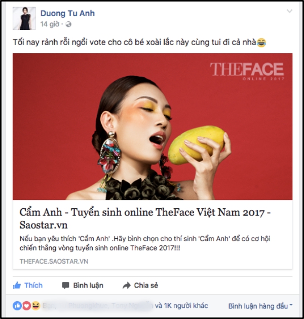 Á hậu Tú Anh kêu gọi vote cho Cẩm Anh.