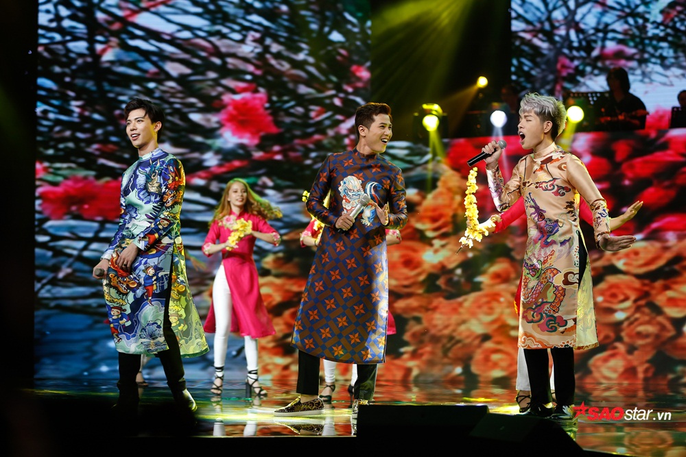 Không kém cạnh “hội chị em”, bộ ba Mai Tiến Dũng, Đức Phúc và Erik cũng gây ấn tượng mạnh với tiết mục Anh cho em mùa xuân. Đây cũng là tiết mục rộn ràng, ngập tràn màu sắc đúng với chủ đề “Xuân Bolero” nhất đêm thi.