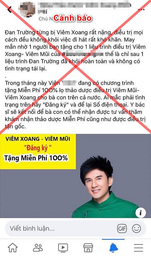 Đi kèm bài viết là ảnh chụp màn hình của một fanpage với nội dung: “Đan Trường bị viêm xoang rất nặng, điều trị mọi cách đều không khỏi, việc đi hát rất khó khăn. May mắn được một người bạn tặng cho 1 liệu trình điều trị viêm xoang, viêm mũi…Thế là chỉ sau một thời gian điều trị Đan Trường đã hoàn toàn khỏi và không có tình trạng tái lại”.