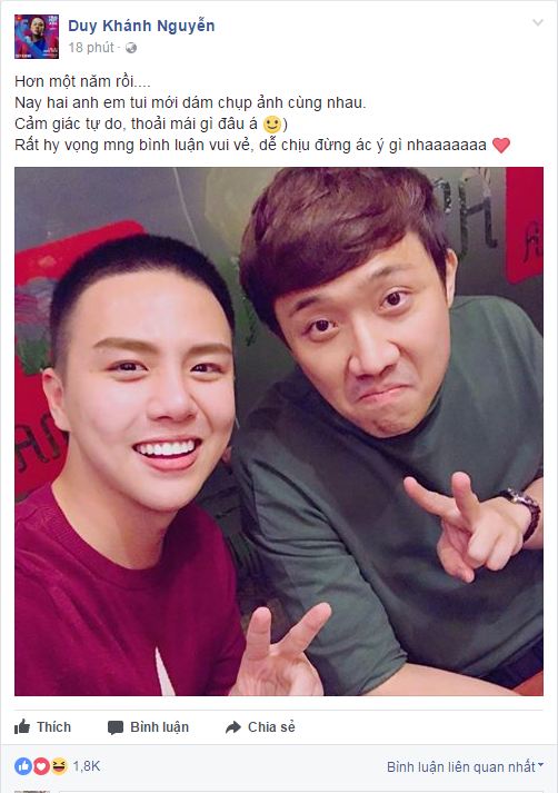 Tuy chia sẻ ảnh chụp cùng nhau nhưng Duy Khánh vẫn hy vọng mọi người sẽ không có những lời bình luận ác ý, tránh gây ảnh hưởng đến hạnh phúc riêng của Trấn Thành với bà xã Hari Won.